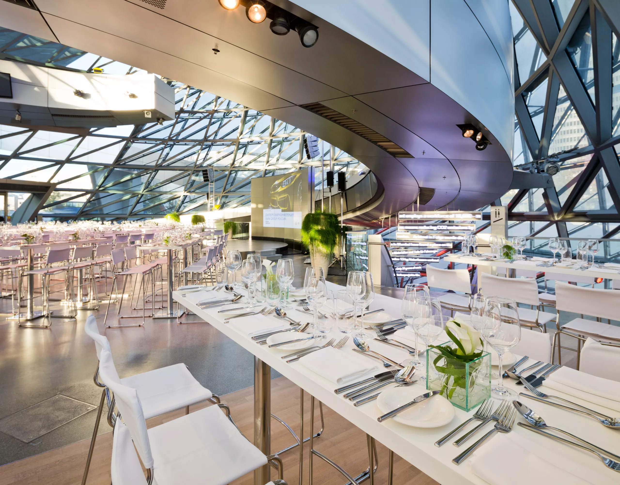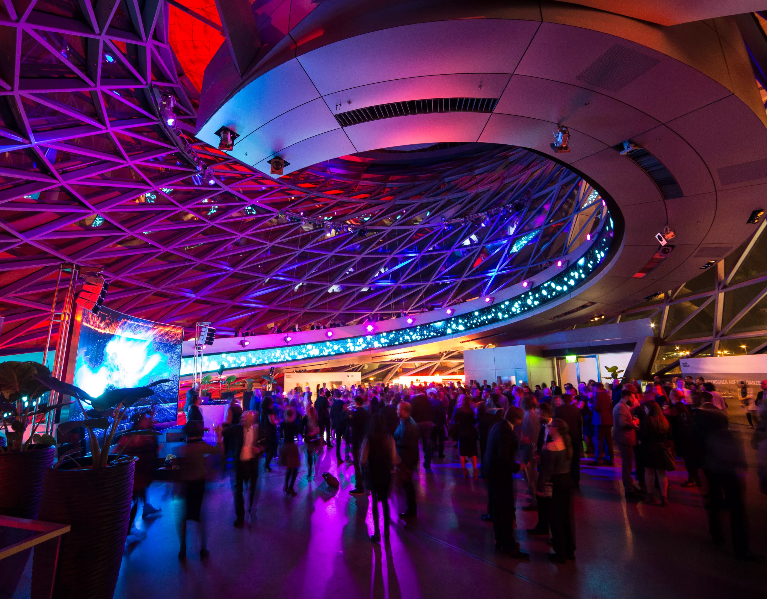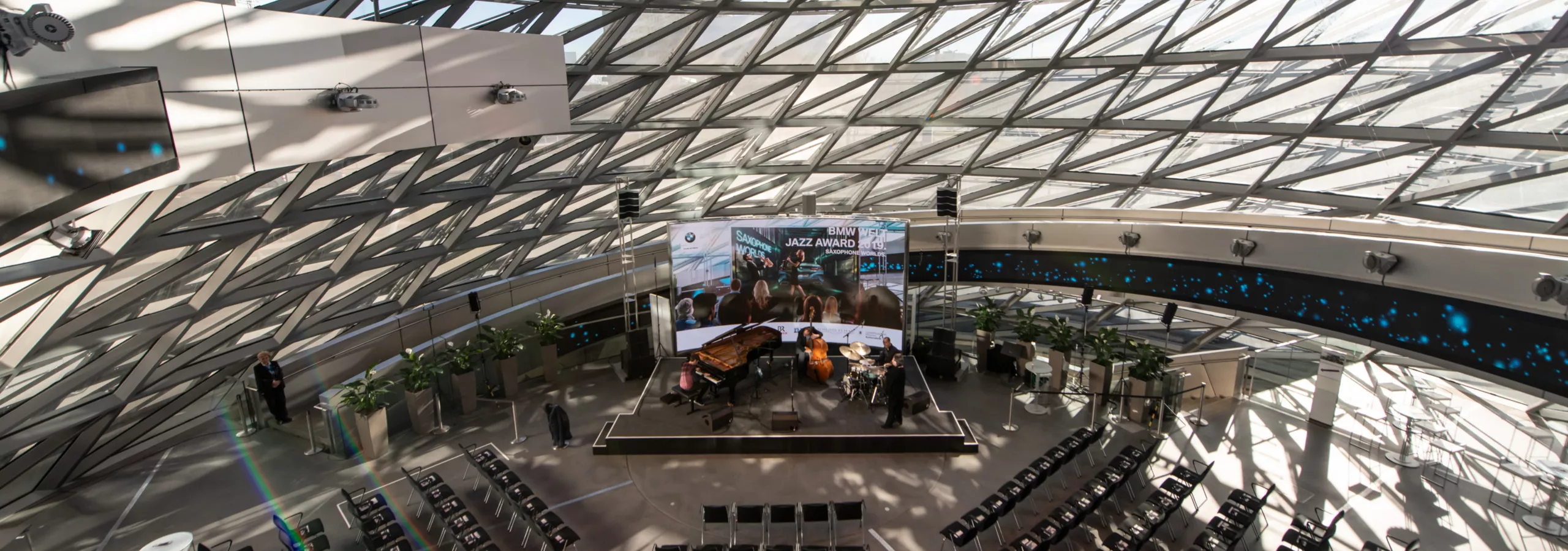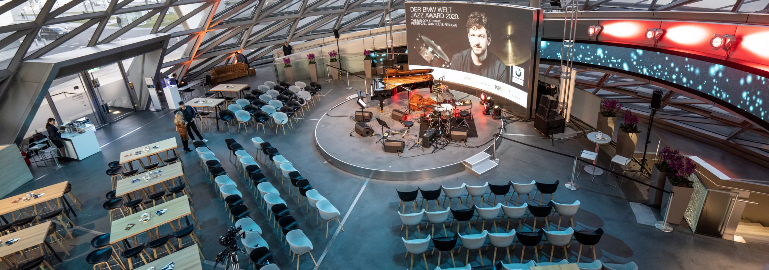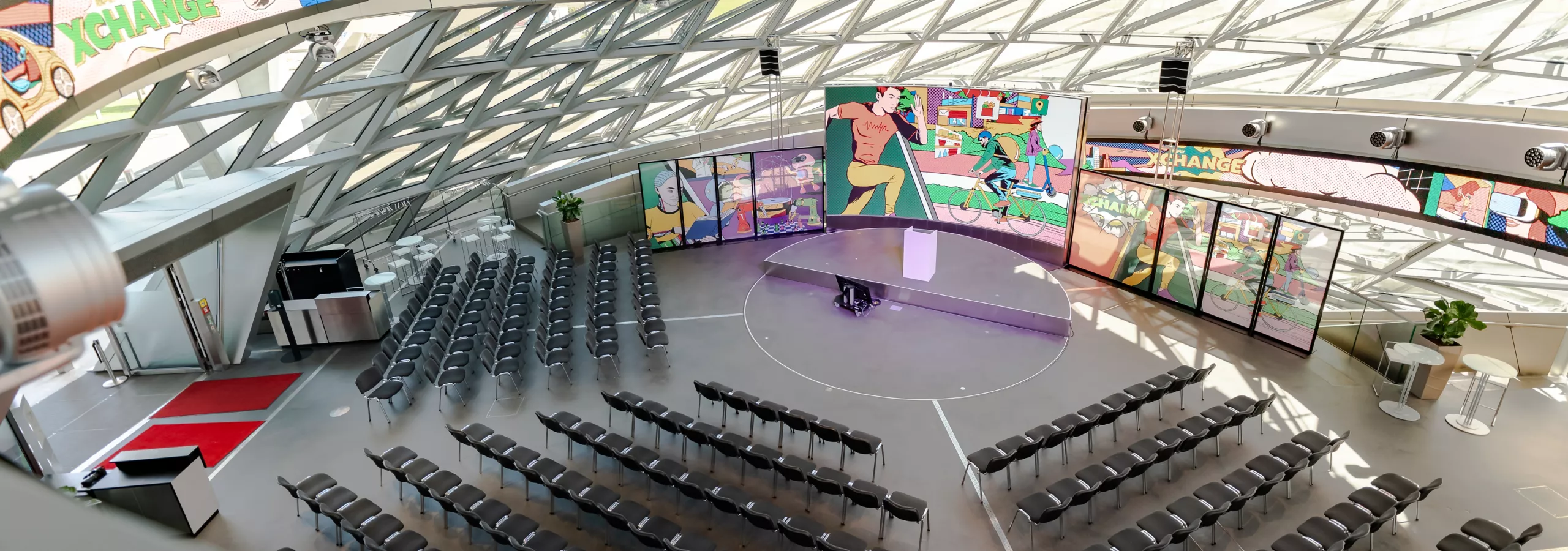 Buchen Sie das Wahrzeichen der BMW Welt, den BMW Doppelkegel, und profitieren Sie von einer Location mit modernster Medientechnik: Eine LED-Video-Wall und die durchgehende Video-Wall auf der Spindel des BMW Welt Doppelkegels geben Ihnen die Möglichkeit zu hochemotionalen Inszenierungen, die je nach Anlass faszinieren, beeindrucken oder Spaß machen. Darüber hinaus stehen Ihnen eine professionelle Licht- und Tonanlage sowie eine höhenverstellbare Rundbühne mit einem Durchmesser von sieben Metern für Ihre Inszenierungs- und Präsentationsideen zur Verfügung. So machen Sie aus jedem Programmpunkt ein effektvolles Highlight – und können dank der verfügbaren Technik auch TV- und Streamingformate produzieren.