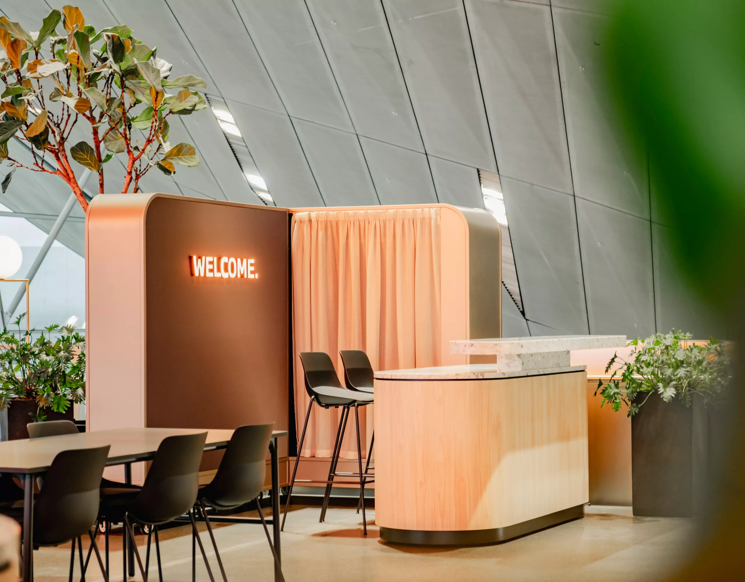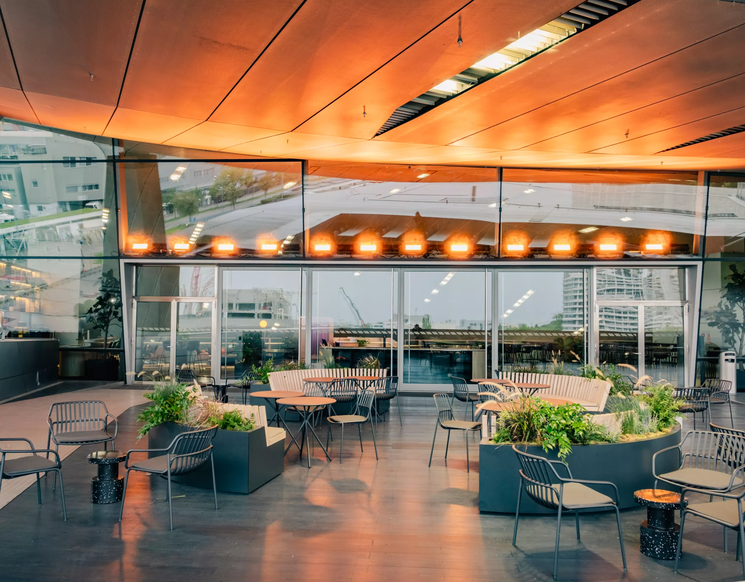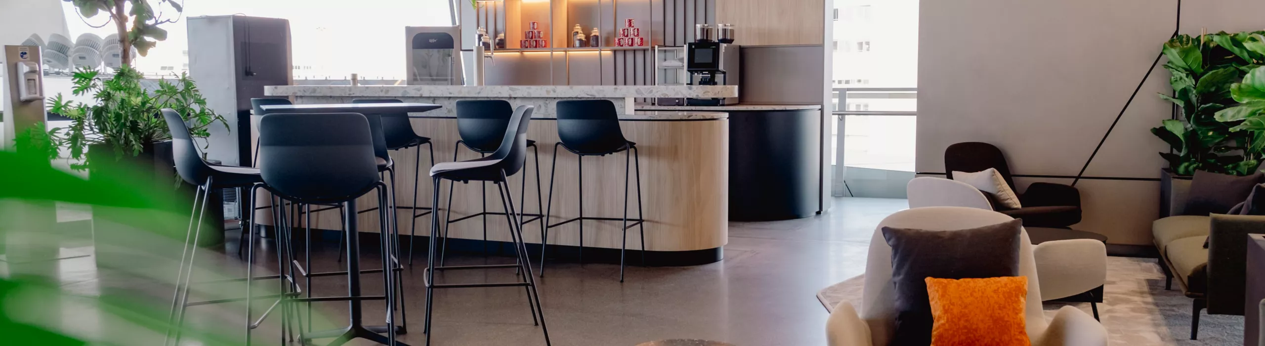 - Permanently installed bar and lounge furniture inviting guests to relax