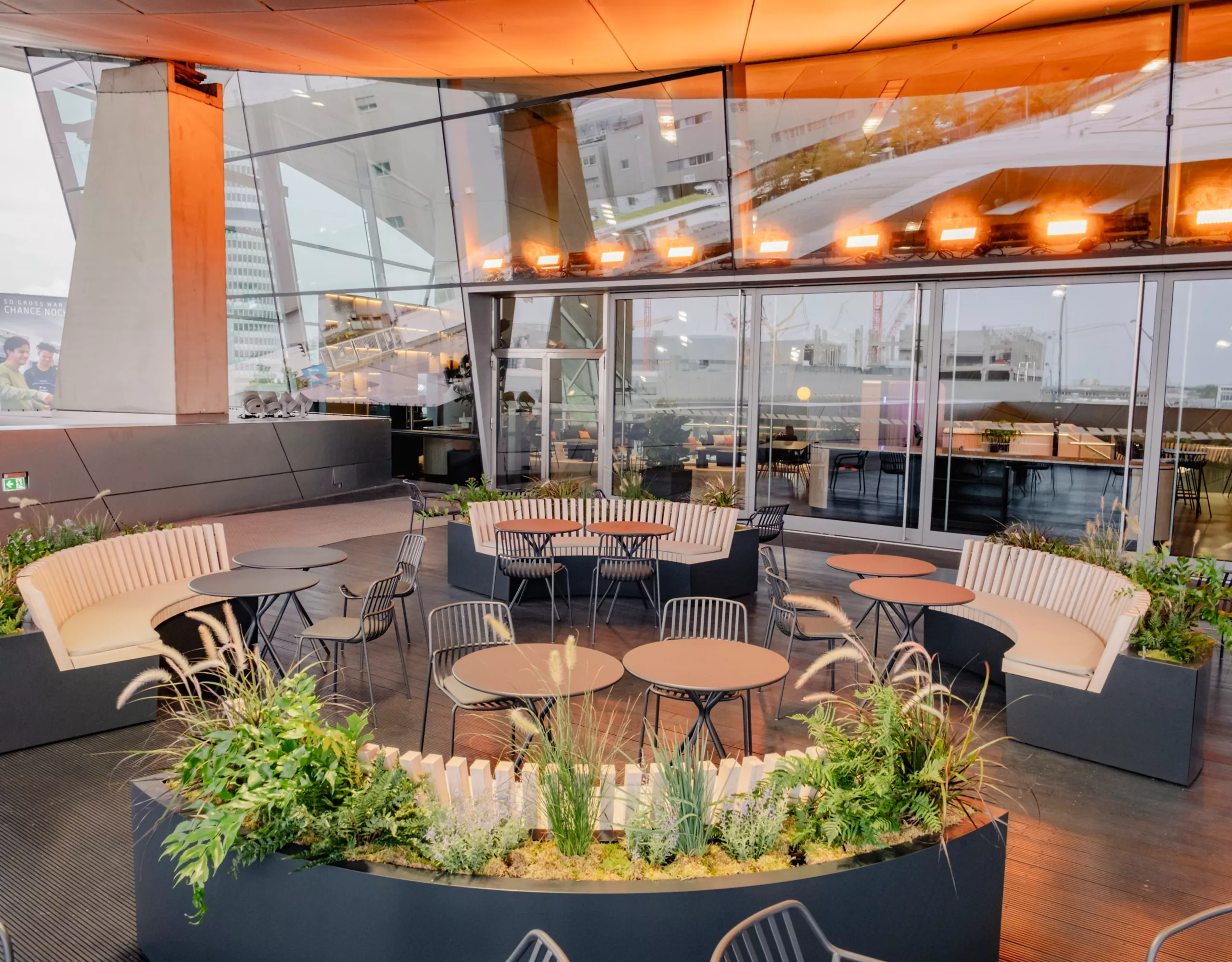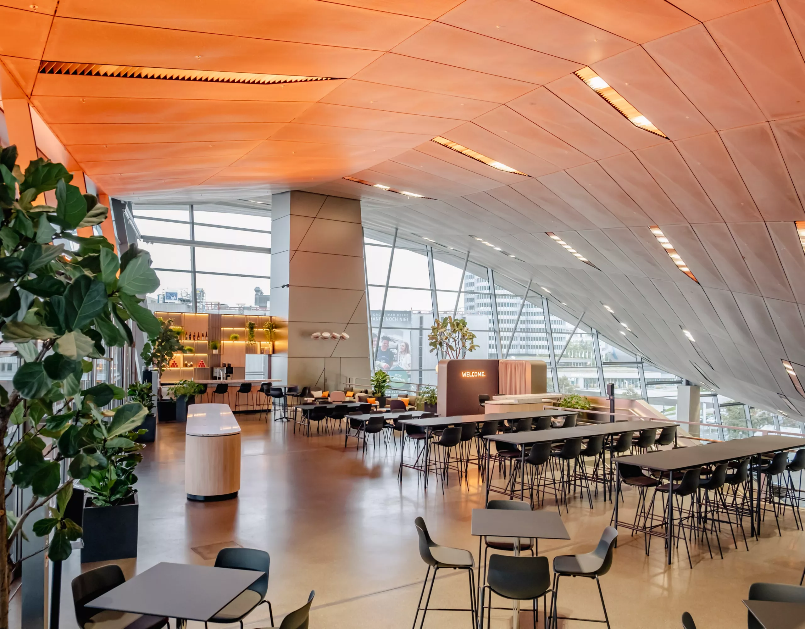 Both locations share the staircase in the exhibition hall and are as well accessible via escalator. For the technical equipment, we will be guided entirely by your preferences. Book the indoor gallery and rooftop and turn your event high above the BMW Welt into a highlight in the truest sense of the word!